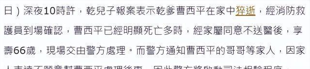 事情发生在昨天晚上,干儿子发现曹西平老爷子没了生命的迹象,于是就打电话叫来的救护人员。 当相关工作人员赶到的时候,他已经走了很久了,甚至遗体都已经僵硬了,出现了尸斑,