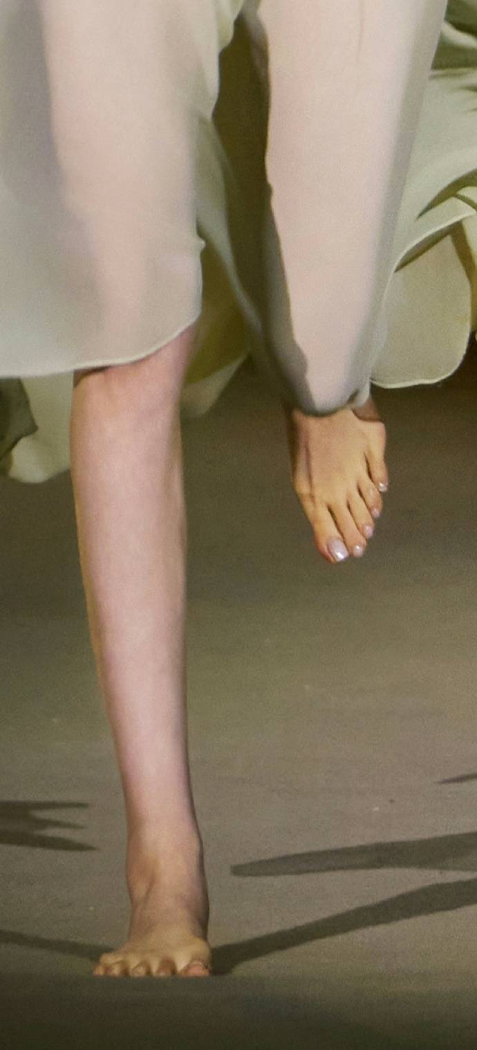同样在2025年Vogue盛典上,欧阳娜娜的赤脚登场则带着少女特有的率性。头纱轻覆、裙摆飞扬间,她蹦跳着走过红毯的身影,打破了红毯固有的庄重感。这让人想起2018年克里斯汀·斯图尔特在戛纳电影节上的经典瞬间——当她被要求更换高跟鞋时,干脆脱下鞋子拎在手中,赤脚完成整场亮相。「有些规则早该改变了,」她在采访中直言,「没人会要求男性用特定方式着装,为什么女性要被高跟鞋绑架?」这种对性别规训的反抗,让赤足成为跨越国界的表达符号。
